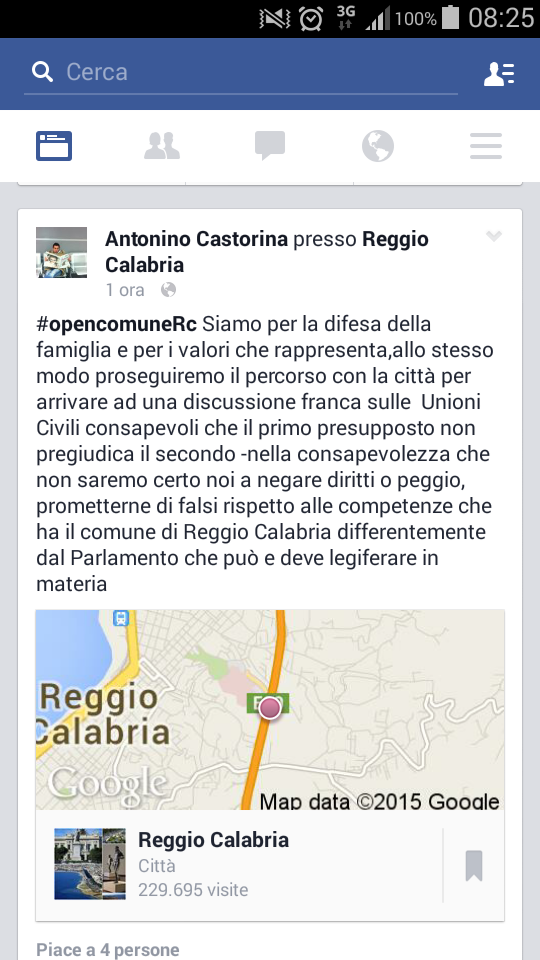 In un post sulla propria pagina facebook Antonio Castorina, capogruppo PD al Consiglio comunale di Reggio Calabria, già rinnega la mozione sulla famiglia che lui stesso ha votato. Nella mozione, infatti, si legge testualmente che “il Consiglio comunale dichiara la propria opposizione a qualunque tentativo di introdurre nell’ordinamento giuridico disposizioni normative tali da alterare la stessa struttura della famiglia”. Tale posizione cozza inesorabilmente con le parole di Castorina il quale dichiara che si proseguirà ugualmente con “il percorso con la città per arrivare ad una discussione franca sulle Unioni Civili”. Il registro delle Unioni Civili, però, di fatto crea un modello parallelo alla “struttura della famiglia” alterandone inevitabilmente il ruolo etico e sociale della stessa già riconosciuto dalla Costituzione italiana all’art. 29 e dalla Dichiarazione Universale dei Diritti Umani all’art. 16. Un modello, quello delle Unioni Civili, che come più volte abbiamo ribadito è diseducativo per le giovani generazione in quanto offre un’aspettativa di precarietà e di irresponsabilità rispetto all’istituto del matrimonio. Ma soprattutto è un modello che a legislazione vigente resta illegale in quanto non rientra nelle competenze di qualsiasi amministrazione comunale. Di questo lo stesso Castorina sembra esserne consapevole in quanto lui stesso nel suo post scrive che “non saremo certo noi a negare diritti o peggio, prometterne di falsi rispetto alle competenze che ha il Comune di Reggio Calabria differentemente dal Parlamento che può legiferare in materia”. Nonostante, quindi, lo stesso Castorina ammetta che il Comune, attraverso il registro delle Unioni Civili, non può riconoscere falsi diritti, sembra non curarsene e voler far proseguire l’amministrazione comunale verso un progetto totalmente illegale e senza alcun valore giuridico, quindi totalmente ideologico indirizzato alla rottamazione della famiglia naturale. Insomma, a nemmeno 24 ore dall’approvazione della mozione sulla famiglia naturale dobbiamo segnalare e denunciare questa preoccupante e contraddittoria giravolta di uno dei maggiori esponenti della maggioranza. Ma come più volte ribadito insieme ad altre associazioni impegnate nella promozione della famiglia siamo pronti a scendere in piazza.