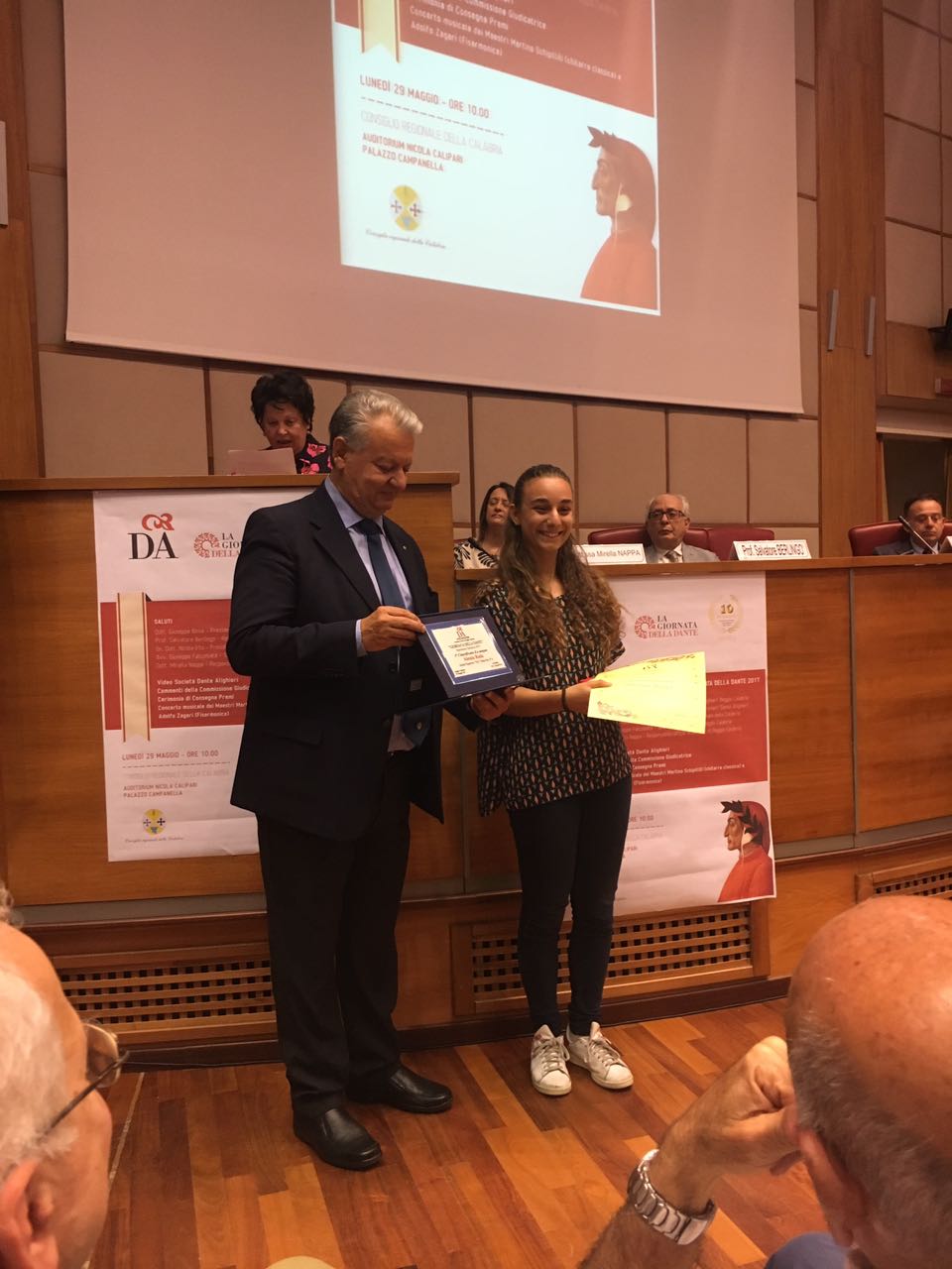 La studentessa Alessia Reda si è classificata 3^ ex aequo, avendo dimostrato particolare attitudine e versatilità sui temi danteschi, oltre che autonomia critica ed espositiva, ed ha vinto tre libri ed un distintivo della Dante Alighieri.