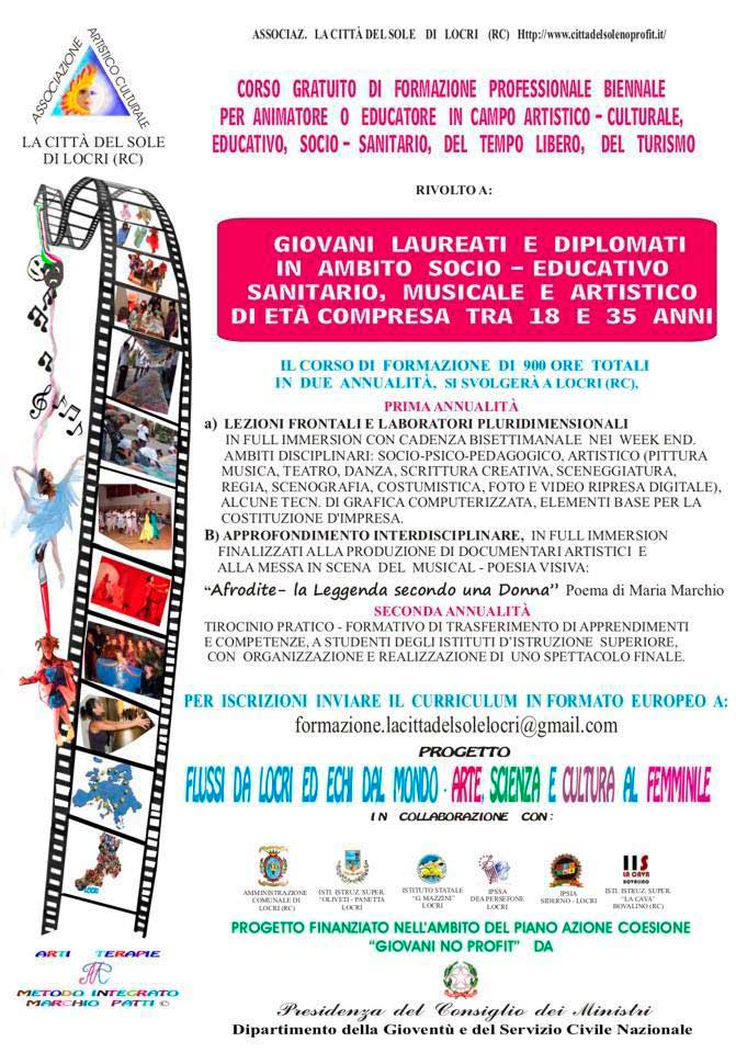 L’Associazione Artistico – Culturale “La Città del Sole” di Locri rende noto di aver chiuso le iscrizioni per l’ammissione al Corso gratuito di formazione biennale per animatore o educatore in campo artistico – culturale, educativo, socio – sanitario, del tempo libero, del turismo, denominato “Flussi da Locri ed echi dal Mondo – Arte, Scienza e Cultura al femminile”. Tale progetto, che prevede numerosi partner istituzionali locali, è finanziato nell’ambito del Piano Azione Coesione “Giovani No Profit” da parte della Presidenza del Consiglio dei Ministri – Dipartimento della Gioventù e del Servizio Civile Nazionale.
