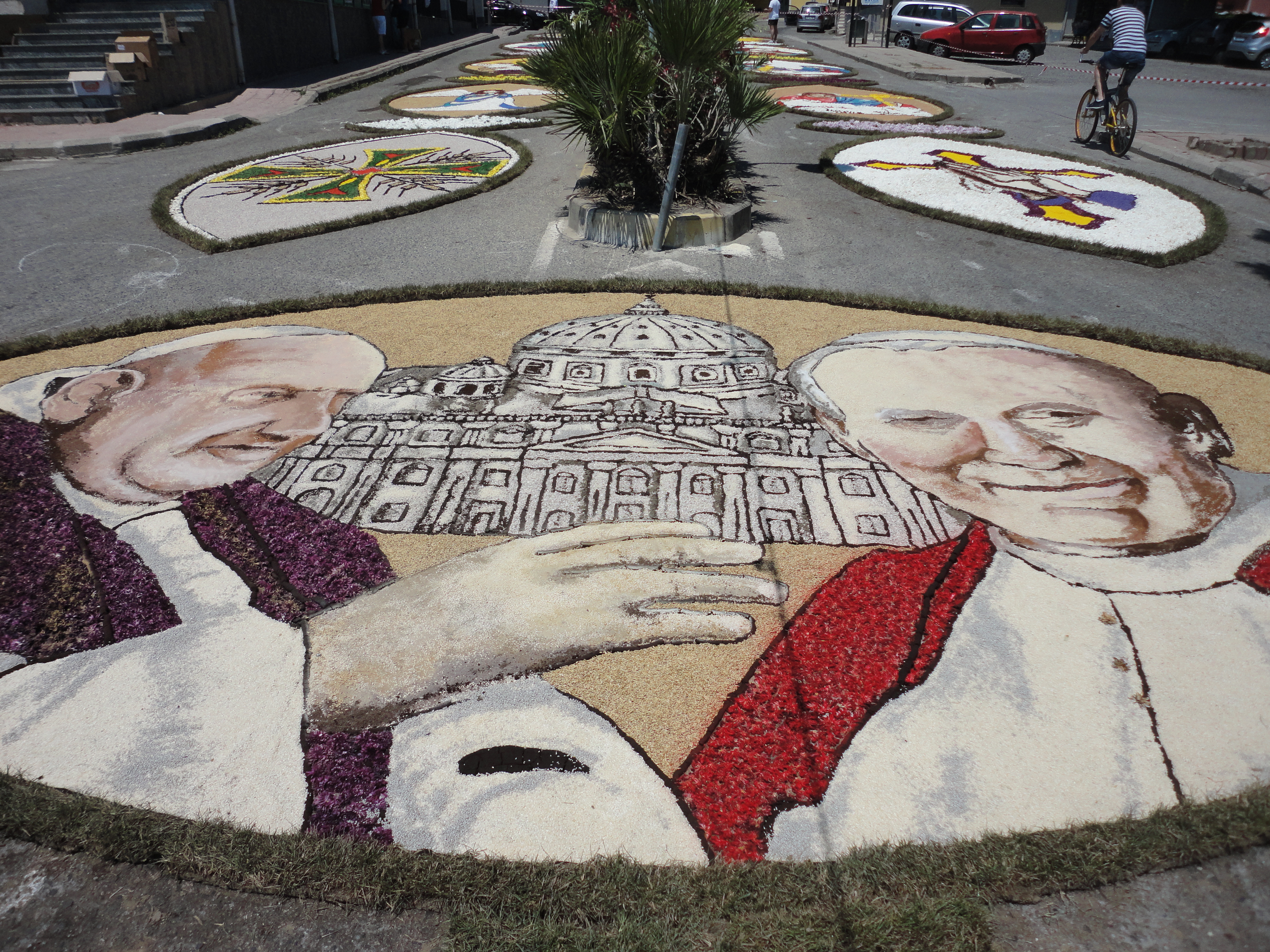 Davanti all’altare due tappeti: il più importante, realizzato dal gruppo Olimpia, rappresenterà l’immagine di Madre Teresa di Calcutta, ricoprendo un’area complessiva di oltre 30 mq; il secondo più piccolo (di m. 4 x 2), ma non per questo meno significativo realizzato dai bambini della nostra comunità raffigurante le mani di un bimbo che volano una colomba bianca, simbolo di pace.