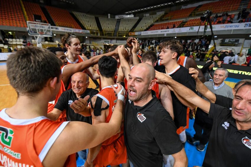 Viola:Aguzzoli 20,SImonetti,Konteh,Maksimovic 7,Mavric 16,Cessel 9, Seck 7,Binelli 6,Tyrtyshnik 23, Russo. Alle Cigarini – Assi D’Agostino.