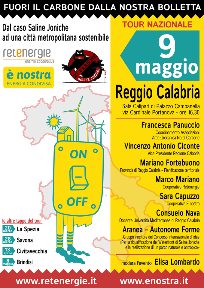 Il 9 maggio c/o Sala Calipari di Palazzo Campanella, sede Consiglio Regionale, il Coordinamento Associazioni Area Grecanica accoglierà a Reggio Calabria il Tour “Fuori il carbone dalla nostra bolletta” della Cooperativa Retenergie per un nuovo modello di gestione collettiva del bene comune energia. Energia rinnovabile realizzata da impianti costruiti attraverso l’azionariato popolare e venduta ai soci insieme alla fornitura di servizi quali analisi e riqualificazione energetica, gestione gruppi acquisto, cambio fornitore di energia.