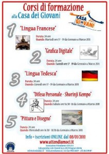 A partire dal mese di gennaio la Casa dei Giovani ospiterà un corso di Shorinji Kempo – Difesa personale, che si svolgerà ogni sabato a partire dal 29 gennaio dalle ore 16.30 alle 18, per scoprire le tecniche di attacco e difesa proposte da questa arte marziale orientale; un corso di grafica digitale, per rimanere al passo con i tempi, si svolgerà ogni lunedì, a partire dal 24 gennaio, dalle ore 17 alle 19. Chi vuole mettere alla prova le proprie capacità artistiche o affinare il proprio estro creativo potrà partecipare al corso di pittura e disegno, che si svolgerà ogni mercoledì dal 26 gennaio dalle 16.30 alle 18.30. Infine, per chi vuole conoscere nuove lingue ci sarà la possibilità di seguire i corsi di francese (ogni martedì, dal 25 gennaio, dalle 17 alle 19) o di lingua tedesca (ogni giovedì, dal 27 gennaio, dalle 17 alle 19).