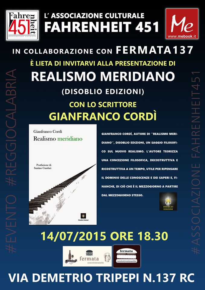 L’Associazione culturale Fahrenheit 451 di Reggio Calabria organizza martedì 14 luglio 2015, presso il locale Fermata 137 wine&food la presentazione del libro “Realismo Meridiano” dello scrittore e filosofo Gianfranco Cordì (Disoblio Edizioni). Modera l’evento Francesca Martino.