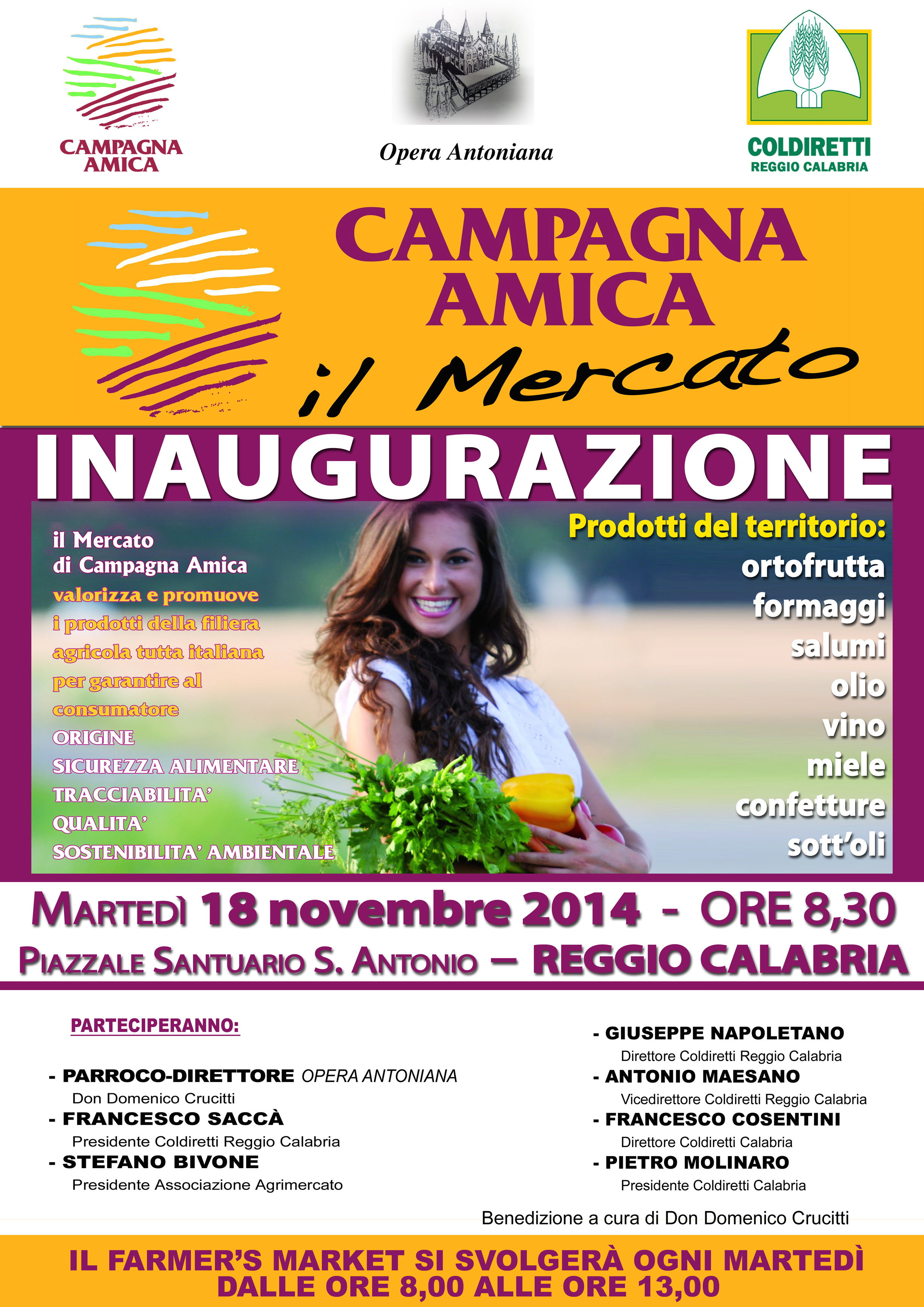 Martedì 18 novembre 2014 alle ore 8.30, sarà inaugurato il 3° Mercato di Campagna Amica nel comune di Reggio Calabria, avrà cadenza settimanale, si svolgerà dalle ore 8.00 alle ore 13.00 di ogni martedì nel piazzale del Santuario di S. Antonio.