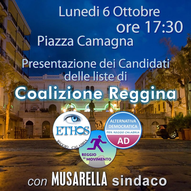 Oggi, Lunedi 6 ottobre alle ore 17:30 nella centralissima piazza Camagna, il comitato civico Reggio in Movimento (www.reggioinmovimento.it) presenterà pubblicamente i propri candidati all’interno della lista civica ETHOS di Coalizione Reggina con Giuseppe Musarella sindaco.