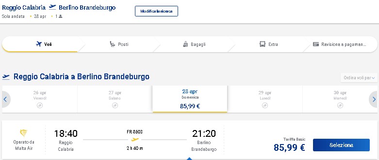 Sono finalmente prenotabili le otto destinazioni sul sito Ryanair da e per Reggio Calabria. Nello specifico le rotte internazionali ed i costi dei biglietti da Reggio Calabria per i voli che inizieranno a fine Aprile. Nelle schermate si puó vedere come le tariffe base (solo bagaglio a mano) sono a partire da 81.99 euro a tratta (85.99 per Berlino).
