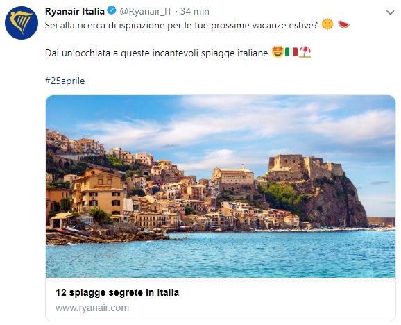 “Sei alla ricerca di ispirazione per le tue prossime vacanze estive?” si legge nel post e di seguito appare un link in cui sono citate dodici spiagge italiane da sogno.
