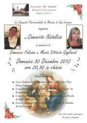 Concerto natalizio in memoria di Domenica Falcone e Maria Vittoria Gagliardi. Domenica 30 dicembre alle ore 20.30 si terrà questo momento organizzato dalla comunità parrocchiale di Marina di San Lorenzo. Nella chiesa della SS Trinità di Marina di San Lorenzo si esibiranno i cori polifonici Interparrocchiale dell’Isodia “Don Pietro Polimeni”, “Santi Pietro e Paolo” di Pentedattilo, “Maria SS Annunzita e S.Nicola di Bari” di Roghudi, il coro e coretto parrocchiale “SS Trinità” di Marin di San Lorenzo. Don Giovanni Zampaglione, parroco del luogo, nell’invitare le famiglie, ha dichiarato che di <<aver scelto questo giorno perché é la festa della Santa Famiglia di Gesù Maria e Giuseppe. Certo è una famiglia particolare, ma che ancora ha molto da dire e offrire a tutte le famiglie del nostro tempo. Auguro ai genitori e ai figli di oggi di guardare alla Sacra Famiglia di Nazaret in maniera da comprendere il modo di vivere in famiglia e di rispondere sempre meglio ai disegni di Dio. Di fronte ad un anno che si chiude ed ad un altro che si apre, mi auguro che in ogni famiglia ci sia unità e pace>>.
