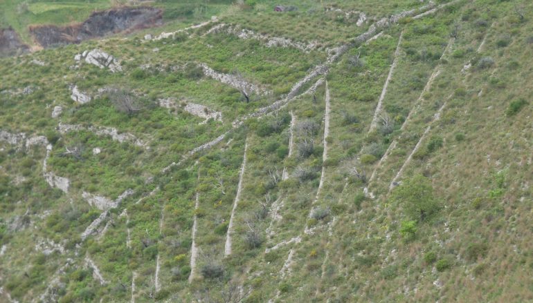 Un’operatrice della soprintendenza che ha ricevuto il materiale ha stimato essere di epoca molto antica, forse età del ferro. Proprio a monte Scifa sono state rinvenute molte tracce di frequentazioni della prima età del ferro, è probabile che questa di Ginarra fosse coeva. Ma forse non lo sapremo con certezza perché nessuno ha voluto accertarlo, ma ai tombaroli questo non importa possono continuare indisturbati. Dicevamo anche di storia e fatica umana, si perché a vedere la valle, sottostante la cima, come è stata terrazzata nei secoli scorsi si resta sorpresi per la perizia e la grazia con cui la semplice sistemazione del terreno da sgretolamento ha prodotto una figura che delinea una lisca di pesce. Al centro una strada selciata della larghezza di circa due metri delimitata da due muri possenti in pietra e da cui si dipartono seguendo l’andamento delle curve di livello altrettanti ponderosi muri a due sezioni molto larghe alla base, per sostenere la spinta del terreno, e un po’ più snelle nell’elevato. Nel complesso vista dall’alto, abbiamo le foto aeree realizzate col drone, è la lisca di una sogliola in formato gigante.