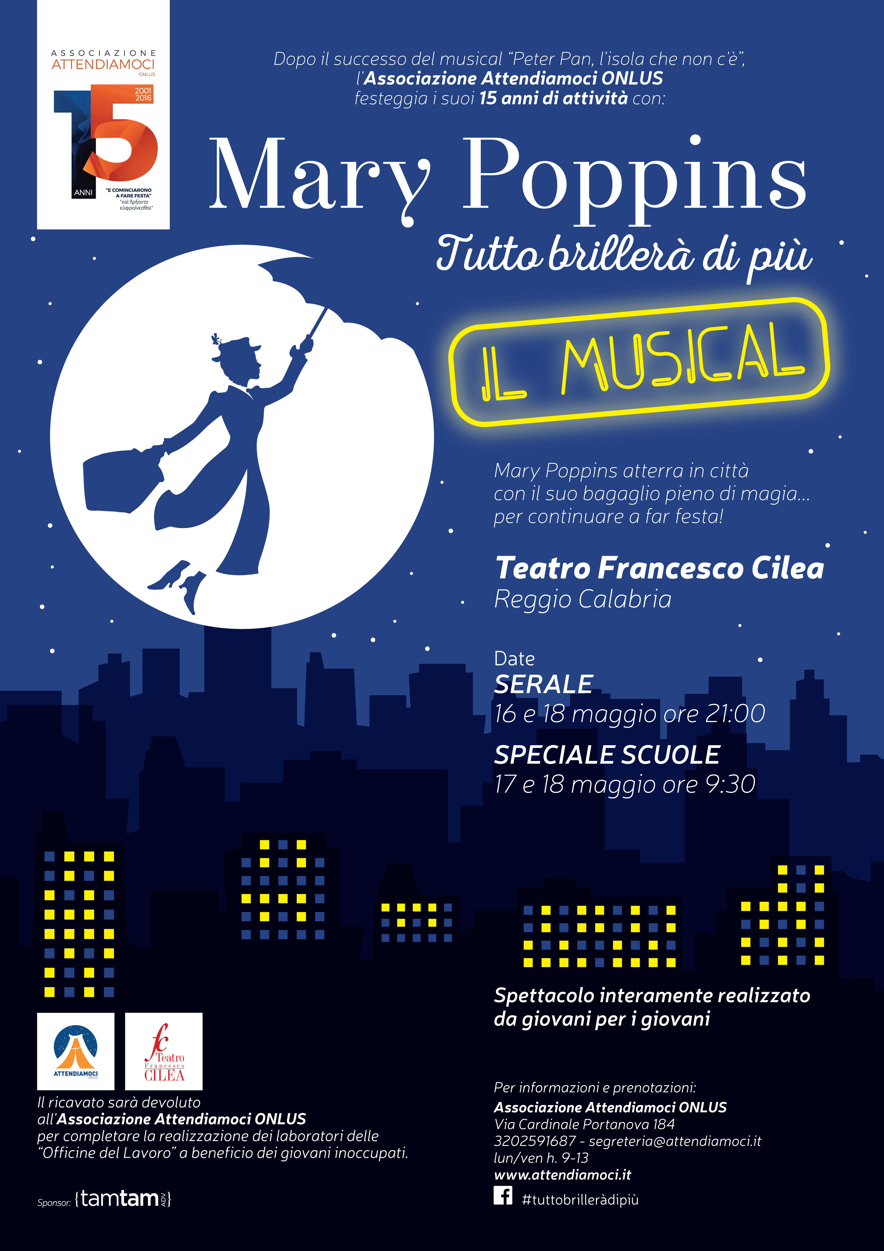 L’Associazione Attendiamoci ONLUS, all’interno delle attività per il 15esimo anno di servizio ai giovani, dopo il successo del 2016 con la rappresentazione del Musical “Peter Pan”, organizza un nuovo spettacolo carico di emozioni: il Musical “Mary Poppins, tutto brillerà di più”.
