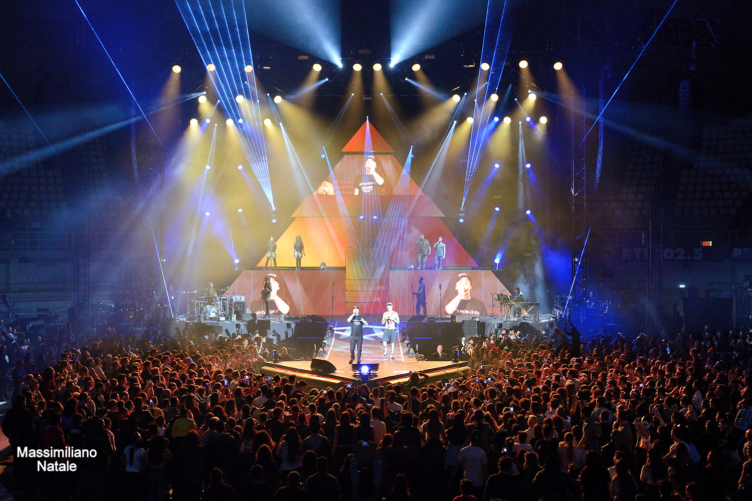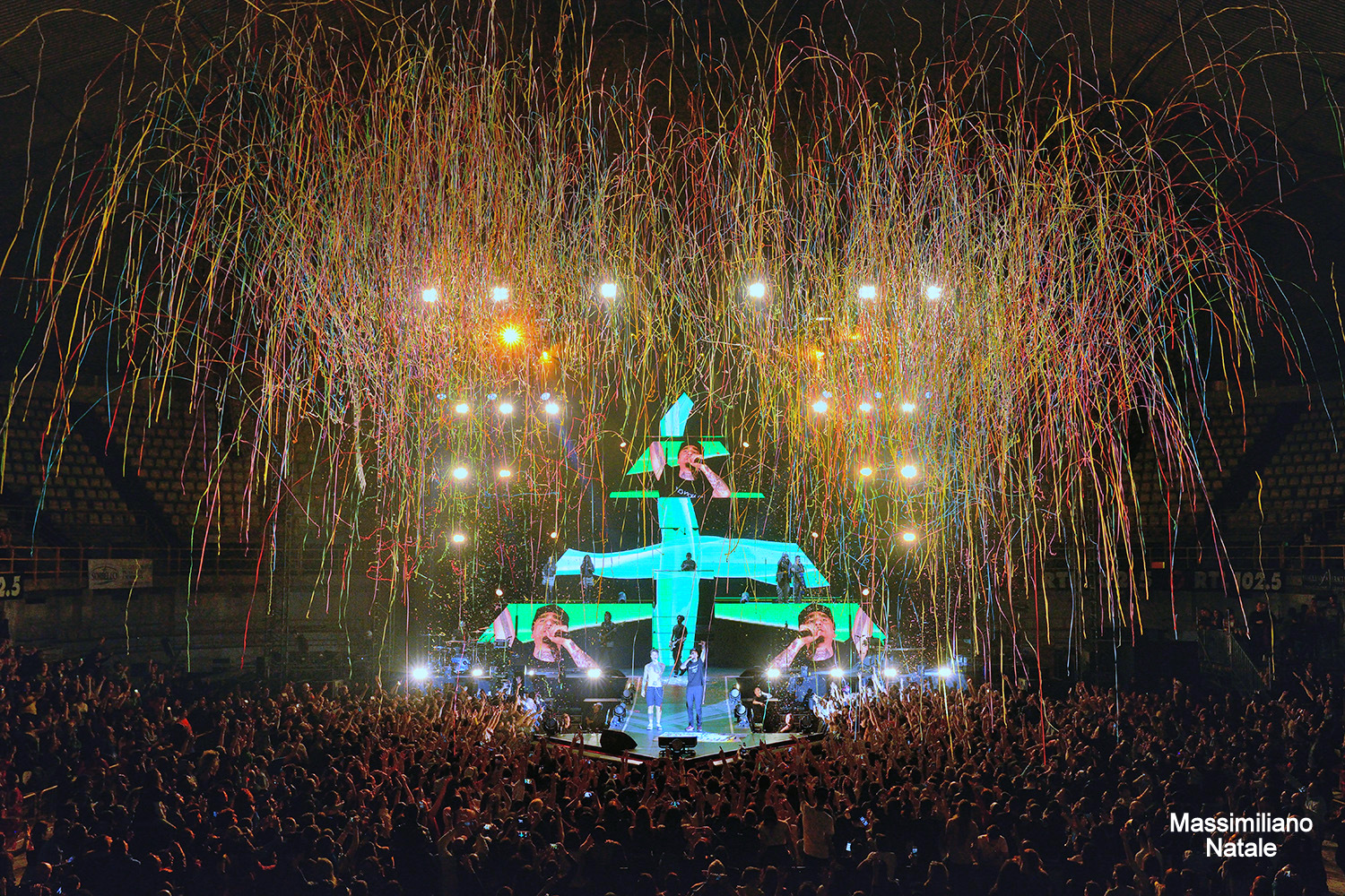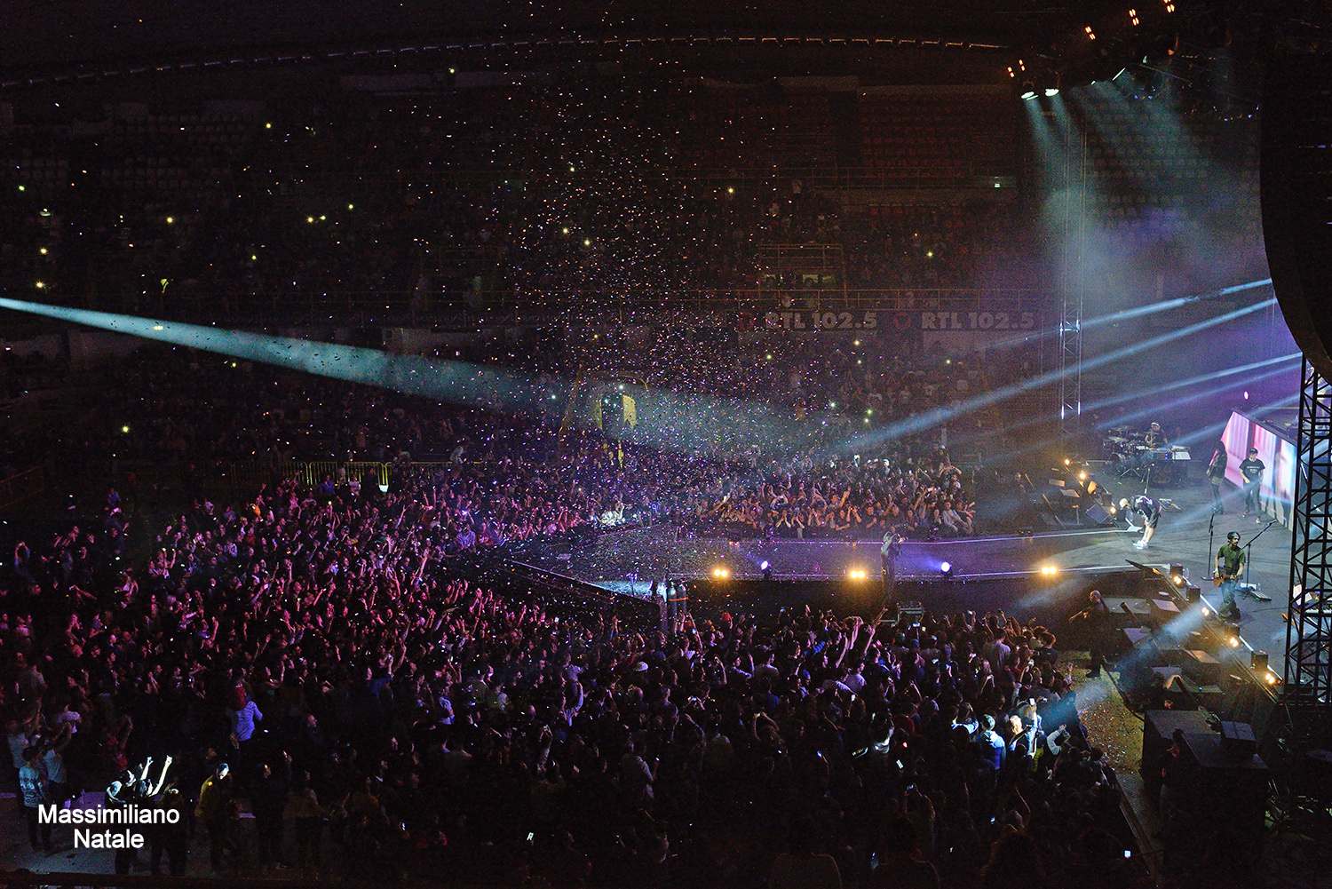 Un live straordinario, studiato in ogni dettaglio, con suggestivi impianti scenotecnici incastonati nell’imponente palcoscenico ricco di effetti ad alta tecnologia. Davvero spettacolare l’insieme di luci, immagini, effetti scenici e finanche pirotecnici, che hanno trasformato il palasport in un catino di contagioso entusiasmo e incontenibile energia.