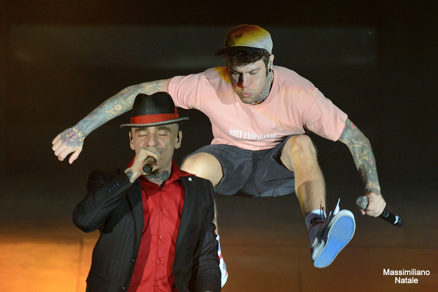 Una scaletta mozzafiato, con oltre trenta brani, che non ha dato tregua al calorosissimo pubblico, infiammato dai tanti celebri successi fino ad un vero delirio di gioia e allegria. Tra i più applauditi, cantati e ballati, certamente il nuovissimo “Piccole Cose”, “Assenzio”, “Fratelli di Paglia”. Ed ancora “Gente che spera”, “Uno di quei giorni”, “Comunisti con il Rolex”, fino all’esplosione conclusiva con l’irresistibile “Maria Salvador” e “Vorrei ma non posto”, il super successo della scorsa estate che ha anticipato l’intero nuovo album e questo tour da record. Una lunga pedana a freccia ha consentito a J-Ax e Fedez di raccogliere da vicino l’affetto e l’abbraccio dei fans arrivati sin dalla mattina da ogni angolo della regione.