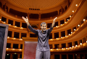 Lo spettacolo ha coinvolto il pubblico direttamente sul palco, trasformandolo in parte integrante del percorso introspettivo del protagonista. La scena essenziale — trono, specchio, pianoforte e microfono — ha accompagnato un viaggio sonoro tra vibrazioni planetarie e musiche composte dalle frequenze del DNA umano.