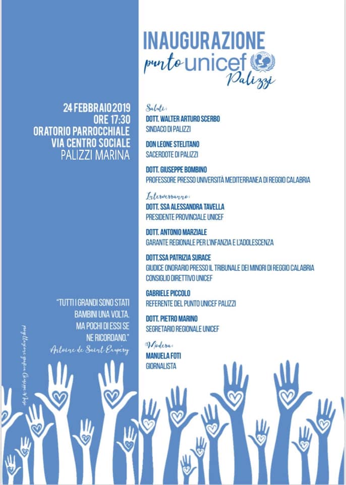 Le novità non sono ancora finite. Il 24 febbraio 2019 alle 17.30, sarà inaugurato il nuovo Punto Unicef di Palizzi. Il Referente locale sarà Gabriele Piccolo.