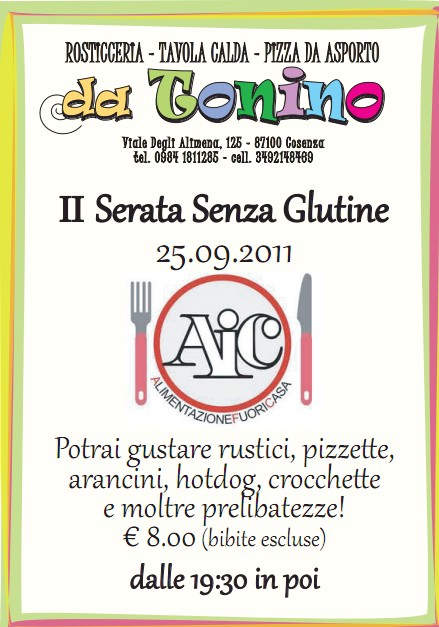 La Rosticceria Da Tonino ha organizzato per il 25 settembre la II Serata Senza Glutine a Cosenza. Dalle ore 19.30 in poi si potranno gustare rustici, pizzette, arancini, hotdog, crocchette e molte prelibatezze.