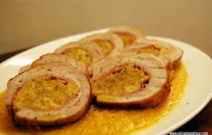 PREPARAZIONE: sgranate i piselli, sciacquateli in acqua corrente. Pulite i porri eliminate la parte verde e tagliateli a rondelle. Tagliate a dadini il formaggio ed il prosciutto. In una padella mettete 2 cucchiai d’olio e aggiungete i porri facendoli rosolare per 1 minuto, mescolandoli. Unite i piselli, mezzo bicchiere di vino e fate cuocere per 5 minuti, aggiustando di sale. Fate rassodare le uovo in acqua bollente per 8 minuti: raffreddatele sotto acqua corrente e sgusciatele. Scolate parte dei piselli e dei porri e uniteli in una ciotola al prosciutto e alla fontina. A questo punto aprite la lonza con un taglio a tasca e versate metà degli ingredienti al suo interno; disponete all’interno anche le uova sode mettendole in fila, ravvicinate, aggiungete il resto degli ingredienti. Chiudete l’apertura con del filo da cucina con degli stecchini. In una teglia da forno mettete l’olio rimasto e ponetevi l’arrosto al centro disponendo ai lati i porri rimasti. Infornate a 200 C° e bagnate con il vino rimasto. Fate cuocere per circa 50 minuti rigirando ogni tanto l’arrosto delicatamente e aggiustando, prima di togliere dal forno, di sale e di pepe. Non appena cotto trasferite su un tagliere e preparate delle fette abbastanza spesse che andrete a servire nei singoli piatti.