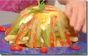 Quando la gelatina inizierà a velare il cucchiaio, versarne un mestolo in uno stampo da bavarese di 22cm di diametro. Decorare il fondo con gli spicchi di uovo, e con il prosciutto cotto. Coprire con un po’ di gelatina e far freddare in frigo. Appena la gelatina sarà solidificata, riempire con metà delle verdure, ad ogni strato diverse, terminando con il pollo. Ripetere nello stesso ordine. Versare nello stampo la gelatina rimasta. Porre in frigo 4 ore.