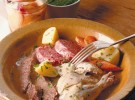 Dividete le cipolle, carote e sedano in due pentole con acqua salata e fate bollire, dopodichè mettete in una il petto di manzo, lo scamone, il fiocco di vitello e il cappone, nell’altra la lingua. Lessate le carni per un’ora e mezza, la lingua per un’ora quindi spellatela e fatela cuocere ancora per un’ora. Forate il cotechino in vari punti, avvolgetelo in un telo e lessatelo per due ore a fuoco vivace. Nel frattempo preparate la salsa aromatica: lavate e asciugate il prezzemolo, il timo, la menta e il basilico. Fate rassodare l’uovo e sgusciatelo. Mettete a bagno in acqua fredda i capperi per 30 minuti, dopodichè sciacquateli. A questo punto tritate tutti gli ingredienti e amalgamate con l’aceto bianco. Trasferite il composto in una ciotola. Incorporatevi poco alla volta l’olio, quindi coprite e fate riposare la salsa per un’ora. Affettate le carni, la lingua e il cotechino e serviteli caldi in tavola accompagnando con la salsa aromatica. Ovviamente il brodo di cottura delle carni può essere utilizzato per varie altre preparazioni.