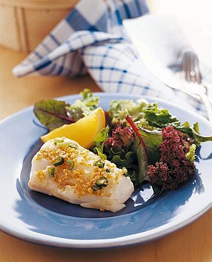 Servite subito il branzino accompagnandolo con l’insalata e uno spicchio di arancia.