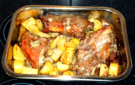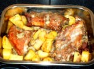 Tagliate ad anelli la cipolle; sbucciate le patate e dividetele grossolanamente a spicchi. Ungete con l’olio una teglia da forno e mettetevi i pezzi di capretto cosparsi di aghi di rosmarino tritati, di sale e di pepe. Tutt’attorno al capretto disponete le patate e le cipolle; salate e pepate anch’esse. Irrorate con quattro o cinque cucchiai d’olio, quindi mettete la teglia sul fuoco finchè i pezzi di capretto saranno ben rosolati. A questo punto irrorate con un altro cucchiao d’olio e con mezzo bicchiere d’acqua calda, togliete la teglia dal fuoco e passatela nel forno, a calore moderato. Portate a termine la cottura facendo attenzione che il sughetto di cottura non si asciughi troppo (nel caso aggiungete dell’acqua calda). A fine cottura, disponete il capretto su un piatto da portata, contornatelo con le patate e le cipolle e servite in tavola.