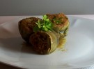 Pulite i carciofi, eliminate le punte, i gambi, le foglie esterne e il fieno interno e metteteli a bagno in acqua e limone. Scolateli, allargate le foglie e salateli internamente. Tritate il caciocavallo e unite il parmigiano grattugiato, il pangrattato, l’uovo, il prezzemolo tritato, salate e pepate quindi amalgamate. Riempite i carciofi con il composto ottenuto e disponeteli in una teglia da forno, versate una tazza d’acqua e dei ciuffi di prezzemolo; bagnate le punte dei carciofi con l’olio, coprite la teglia e cuocete per 10 minuti. Scoperchiate e passate la teglia in forno per 10 minuti a 180°C. Servite i carciofi in tavola caldissimi.