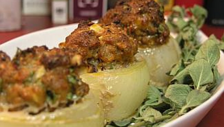 Sbucciate le cipolle e mettetele a bagno per almeno un’ora in acqua fresca affinchè risultino più digeribili. Trascorso questo tempo, tagliatele a metà e asportate loro un pò di polpa formando così un incavo in ogni mezza cipolla. Tritate la polpa tolta e soffriggetela nell’olio, unendovi la polpa di manzo macinata e il pangrattato. Fate prendere colore alla carne, cuocedola a fuoco lento e mescolandola spesso, quindi una volta pronta lasciatela intiepidire. Tritate finemente il prezzemolo e grossolanamente i pinoli, incorporatevi un uovo intero e un tuorlo, il pecorino e la noce moscata grattugiati, la carne cotta, un pizzico di sale e uno di pepe. Amalgamate con cura questi ingredienti, quindi riempite con una cucchiaiata del composto ogni mezza cipolla. Pennellate con l’albume di un uovo, frullato con un pizzico di sale, il ripieno. Ungete d’olio una teglia da forno, disponetevi le cipolle e cuocetele in forno ben caldof inchè non saranno ben dorate.
