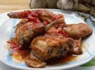 Tagliate a pezzetti il coniglio e tenetelo a bagno in acqua e aceto per circa due ore. Poi rilavatelo, sgocciolatelo bene e disponetelo in un tegame, dove avrete fatto già soffriggere l’aglio nell’olio. Togliete l’aglio, salate e pepate. Lasciate cuocere sino a quando non sarà evaporata tutta l’acqua che fuoriesce dalla carne, solo allora potrete cominciare a versare il vino sui pezzi di carne, poco per volta. Quando anche il vino sarà anche evaporato, aggiungete i pomodori spezzettati, un goccetto d’acqua e lasciate cuocere lentamente col coperchio.