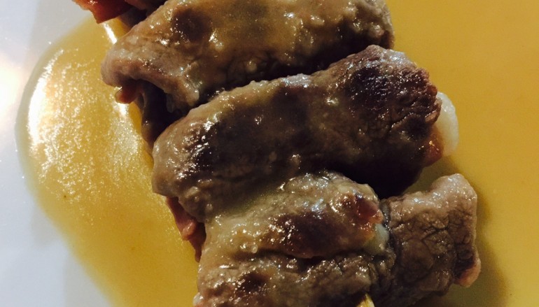 Tagliamo finemente le fettine di entrecote o controfiletto di vitello, mettiamo all’interno una fettina di funghi appena trifolati, una fettina di pancetta arrotolata dolce e un rettangolo di caciocavallo e arrotoliamo.