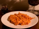 Disossate la coscia del coniglio (se non l’avete presa già disossata) e tagliate la carne a pezzetti. Pulite il porro eliminando le foglie più fibrose e la parte verde e tagliatelo a rondelle. Affettate la cipolla e il sedano quindi fateli rosolare in 4 cucchiai d’olio; unite il porro e la carne, fate insaporire per qualche minuto, dopodichè aggiungete la passata di pomodoro e salate. Tagliate a metà le olive, aggiungetele al sugo, unite l’origano e fate cuocere per 30 minuti a fuoco medio. Lessate al dente le fettuccine, scolatele e conditele subito con il sugo e una manciata di pepe nero.