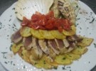 Pelate le patate e tagliatele a fettine sottili, 2 mm circa; lavatele, asciugatele e conditele con sale e olio. Con la metà delle patate formate un manto omogeneo sul fondo di una teglia, adagiatevi sopra i filetti di cernia, copriteli interamente con il resto delle patate e i pomodorini. Aromatizzate a piacere con prezzemolo e/o erba cipollina e/o origano. Mettete in forno a 180 gradi per 25/30 minuti e servite molto caldo.