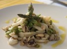 Mescolate la farina con un uovo, il lievito, un bicchiere d’acqua e un pizzico di sale. Lavorate con cura gli ingredienti e fate lievitare la pastella per un’ora. Pulite le seppioline eliminando occhi, beccucci e cartilagini e immergetele nella pastella. Lessate in acqua leggermente salata le punte degli asparagi e toglietele al dente. Sbattete le uova e tuffatevi le punte di asparagi, quindi scolatele e passatele nel pangrattato. Fate scaldare l’olio in una padella, immergetevi gli asparagi e fateli dorare. Poi friggetevi anche le seppioline, scolatele e servitele assieme agli asparagi.