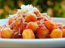 Cuocete le patate in abbondante acqua salata, sbucciatele e passatele, ancora calde, allo schiacciapatate. Aggiungete subito la farina ed il sale ed impastate con cura in modo che tutti gli ingredienti siano ben amalgamati. Formate un rotolo che taglierete in fette dallo spessore di un dito circa. Su di un piano infarinato, formate arrotolando con le mani, un rotolo dello spessore di un dito e ritagliate degli gnocchi di 2 cm l’uno. Per dare loro una bella forma, passateli con l’aiuto del pollice su una grattugia o sui rebbi di una forchetta. Buttateli poi in acqua bollente e, non appena cominciano a galleggiare, scolateli sulla salsa di pomodoro riscaldata in padella con olio extravergine. Aggiungete gli gnocchetti, la scamorza affumicata e delle foglie di basilico tagliuzzate. Lasciate cuocere per 3 minuti e decorate i piatti con le restanti foglie di basilico.