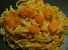 Mondate la zucca, lavatela e tagliatela a fettine molto sottili. In una padella con l’olio fate imbiondire gli spicchi d’aglio quindi aggiungete la zucca, togliete l’aglio e unite le foglie d’alloro. Fate cuocere per 20 minuti, nel frattempo pelate i pomodori, privateli dei semi e spezzettateli; versateli in padella e ultimate la cottura. A parte cuocete la pasta al dente in abbondante acqua salata, conditela con il sugo, spolverate con pepe rosso piccante e abbondante ricotta grattugiata. Servite subito.