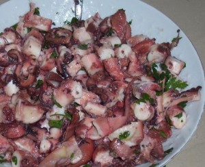 di Francesca Tripodi Lavate i polpi sotto l’acqua fredda, eliminate le interiora, gli occhi e il becco corneo situao al centro dei tentacoli; poneteli in una pentola e ricopriteli di acqua, unite l’aceto e il sale, lessateli per circa 30 minuti, con coperchio, fino a quando riuscite a bucarli facilmente con una forchetta. Scolateli ed eliminate le ventose dai tentacoli, quindi tagliateli a tocchetti. Lavate il prezzemolo e tritatelo finemente; pelate l’aglio e tritate anch’esso. Ponete i tocchetti di polpo in un’insalatiera e conditeli con olio, prezzemolo tritato, aglio, sale e pepe, mescolando bene il tutto e servite.