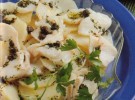 di Francesca Tripodi Lavate e spazzolate le patate e lessatele con la buccia per circa 30 minuti quindi pelatele e tagliatele a fette abbastanza sottili. Lessate il merluzzo per circa 15 minuti, quindi tagliatelo a pezzetti. Mettete le patate e il pesce in un’insalatiera e salate. Tagliate gli spicchi di aglio in quattro e metteteli a sobbollire per 7-8 minuti nell’olio a fuoco moderato. Aggiungete le acciughe e fatele sciogliere schiacciandole con un cucchiaio o una forchetta. Tritate i capperi, mescolateli con il prezzemolo e uniteli all’olio assieme all’aceto. Scaldate ancora per un paio di minuti. Eliminate la’glio, versate il condimento sull’insalata, mescolate con delicatezza e servite.