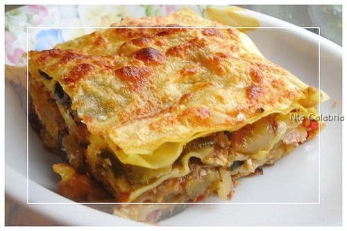 di Francesca Tripodi Impastate su una spianatoia la farina con un pizzico di sale e atnta acqua quanta ne occorre per ottenere un impasto omogeneo. Formate una palla e lasciate riposare per 20 minuti circa coperta da un panno umido. Portate a bollore in una pentola abbondante acqua salata e versatevi detro 2 cucchiai d’olio. Stendete la pasta con il matterello in una sfoglia sottile (potete usare anche la macchinetta per la pasta) e ricavate dei rettangoli di circa 8 x 12 cm e scottateli uno per volta, per circa 2 minuti. Scottateli e metteteli e raffreddare sopra un canovaccio. Pelate le verdure, affettate la cipolla; tagliate i caciofi a fettine sottili, passandoli in acqua e limone. Affettate i funghi e lessateli in acqua bollente per 2-3 minuti. Sbollentate i piselli in acqua salata per 5-7 minuti. Cuocete per 6-7 minuti 2 uova in acqua bollente e con aceto, quindi sgocciolate, fate raffreddare e tagliate a fette. Mescolate in un impasto omogeneola carne macinata, il tuorlo, un pò di sale e di pepe. Formate delle piccole polpette, quindi infarinatele. Scaldate in un tegame due cucchiai di strutto e l’alloro, soffriggete le polpette per qualche minuto. Nello steso tegame, unite altri due cucchiai di strutto, versate la cipolla e fatela leggermente soffriggere, unite le vedure, fate insaporire a fiamma bassa per 10 minuti poi spegnete il fuoco. Ungete una teglia, disponete le lasagne, le fette d’uovo sodo, le polpettine di carne, le verdure, cospargete di pecorno grattugiato, irrorate con un filo d’olio e mettete in forno per 30-40 minuit finchè la superficie sarà dorata. Togliete dal forno e servite caldo.