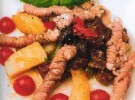 di Francesca Tripodi Pulite con cura gli intestini con acqua tiepida, sale grosso e aceto, quindi formate delle matassine avvolgendole attorno a fegato e polmone ridotti a pezzi di media gandezza. Fatele insaporire, per un paio di minuti, nell’olio nel quale avrete fatto imbiondire l’aglio; bagnate con acqua tiepida, aggiungete le foglie di alloro, le patate sbucciate, lavate e tagliate a spicchi. A metà cottura salate, spolverate d’origano e unite i peperoni lavati e spezzettati, nonchè il peperoncino tritato. Servite caldo.