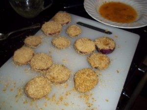 Taglia le cipolle a rondelle spesse mezzo centimetro dopo averle lavate più volte sotto l’acqua corrente. Passale una alla volta nella farina, nell’uovo sbattuto e salato ed infine nel pangrattato col pecorino. Fai scaldare l’olio in una padella e metti le rondelle di cipolla panate. A cuocere a fiamma moderata. Servile calde in un piattino.