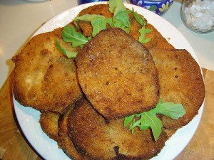 di Francesca Tripodi Lavate le melanzane, eliminate il picciolo, tagliatele per il lungo a fette dello spssore di circa 1/2 cm, disponetele in un colapasta, cospargete con sale grosso e lasciatele riposare affinchè perdano il liquido amaro di vegetazione. Sciacquatele, scottatele rapidamente in acqua bollente, scolatele e asciugatele. Eliminate la crosta sottile al caciocavallo e tagliatelo a fettine sottili. Sbattete le uova in una terrina con un pizzico di sale. Iniziate a coprire le fette di melanzane con il formaggio e il basilico, spolverizzate con il peperoncino piccante; chiudete con un’altra fetta di melanzana, premendo perchè si accoppino bene e continuate fino ad esaurire tutte le fette. Passatele prima nelle uova sbattute, poi nella farina, infine nel pangrattato, premendo bene. Immergete le melanzane così ottenute nell’olio caldo ma non fumante, poche alla volta; fatele dorare da ambo i lati, scolatele su carta da cucina assorbente e, appena saranno tutte pronte, servitele subito calde.