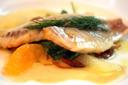 Pulite le orate e mettete nella cavità centrale di ciascuna 2 fettine di aglio, un chiodo di garofano, un pezzetto di scorza di arancia e un ciuffetto di rosmarino. Trasferite le orate in una teglia con un foglio di carta da forno, bagnatele con il succo di mezza arancia e il vino, insaporitele con sale, pepe e un pizzico di cannella. Unite l’arancia rimasta a fettine, l’uvetta e 2-3 ciuffi di rosmarino. Irrorate con un filo d’olio e infornate a 200°C per 10-15 minuti.