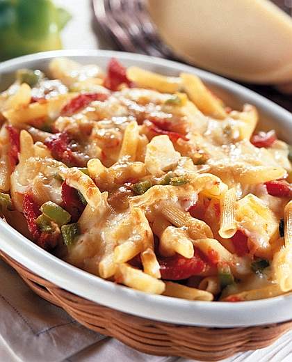 Tagliate la salsiccia a rondelle e il formaggio a pezzetti. In una pirofila formate uno strato di patate, condite con la salsa al peperone e distribuite su questa una parte del formaggio e della salsiccia. Sopra disponete uno strato di pasta, condite con la salsa e proseguite in questo modo, alternando gli ingredienti fino al loro esaurimento. Passate in forno caldo a 200 °C a gratinare e servite.