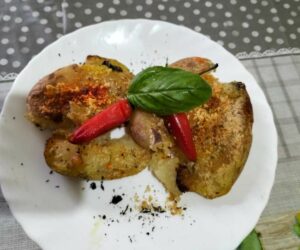 Lavare le patate e farle cuocere con tutte le bucce in abbondante acqua. Una volta cotte, disporle su una pirofila. Con un bicchiere schiacciatele. Aggiungete sopra sale, olio, peperoncino grattugiato, origano, pangrattato e pecorino. Gratinate in forno caldo per dieci minuti.