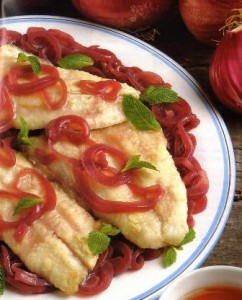 di Francesca Tripodi Affettate finementele cipolle, disponetele in un tegame coperte con il vino rosso e l’aceto e fatele cuocere per 20 minuti a fiamma media. Versate 2 dl di acqua calda e cuocete per altri 15 muinuti, comunque finchè le cipolle saranno morbidissime. A fuoco spento, aggiungete subito il miele, il burro, sale e pepe e mescolate delicatamente per amalgamare la salsa che dovrà assumere una certa densità. Infarinate leggermente i filetti di pesce san Pietro e fateli cuocere per circa 7-8 minuti nell’olio caldo, facendo dorare entrambi i lati. Serviteli in un piatto di portata bagnati con la salsa preparata e aggiungete le foglie di menta.