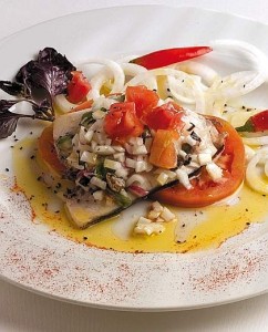 Mettete al centro dei piatti individuali due fette di pomodoro, adagiate sopra il pesce spada e aggiungete la cipolla con i capperi. Completate con qualche dadino di pomodoro, guarnite con foglie di basilico, peperoncino piccante e anelli di cipolla e servite.