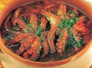 Eviscerate i polipi dopo averli privati del becco e degli occhi, spellateli, lavateli accuratamente e asciugateli. Mettete sul fuoco un tegame di coccio con mezzo bicchiere d’olio e fatevi imbiondire l’aglio e la cipolla tritati finemente. Aggiungete i polipi e bagnateli con il vino che farete evaporare a fuoco vivace. Unite i pomodori pelati, quelli secchi spezzettati, un pezzetto di peperoncino e un pizzico di sale. Cuocete a fuoco lento per circa 40 minuti, la carne deve essere tenera. Togliete dal fuoco e servite guarnito con foglioline di prezzemolo e spicchi di limone.