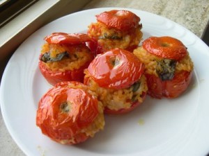 di Francesca Tripodi Lavate i pomodori, togliete con un taglio la superficie e tenetela da parte (servirà da coperchio). Svuotateli delicatamente con un cucchiaio, salateli internamente e metteteli capovolti 30 minuti a sgocciolare. Lavate, e tritate finemente una manciata di foglie di prezzemolo insieme con la menta. Portate a bollore in una casseruola abbondante acqua, salatela, versatevi la pasta e lasciatela cuocere per 10 minuti. Scolatela al dente, mettetela in una terrina e conditela con 2 cucchiai d’olio. Unite il prezzemolo e la menta tritati, una macinata di pepe e mescolate bene. Ungete con un pò d’olio una teglia, appoggiate sul fondo i pomodori, farciteli con la pasta e appoggiate sopra la calotta tenuta da parte. Passate i pomodori ripieni in forno caldo a 180°C e fate cuocere per 20 minuti. Si possono servire sia caldi che freddi.