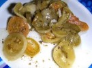 Tagliate a fettine rotonde i pomodori già lavati, metteteli nel colapasta con molto sale e ricopriteli con un piatto, mettendoci sopra un peso. Lasciateli sotto pressa per 2 giorni; poi lavateli, strizzateli e sistemateli in un recipiente di terracotta, formando tanti strati sovrapposti e ben pressati, su ognuno dei quali spargerete altro sale, semi di finocchio e pezzetti sottili di peperoni verdi. Ricoprite il vasetto utilizzando un dischetto di legno come si faceva una volta opprure un piatto diametralmente più piccolo. Sul vaso ponete un peso e controllate che non manchi mai la salamoia che i pomodori e il sale formeranno. Se dovesse mancare preparatela poratando a bollore acqua e sale, nelle dosi indicate, e, ben raffreddata, la verserete nel recipiente. Quando i pomodori saranno maturi, dopo averli tenuti a bagno in acqua fredda per dissalarli un pò, strizzateli e soffriggeteli in olio, quindi serviteli.