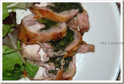 di Francesca Tripodi Pulite e lavate gli spinaci, lessateli per 10 minuti quindi scolateli, strizzateli e tritateli. Tritate finemente il prosciutto, l’aglio e le foglie di rosmarino e rosolate tutto in un pò d’olio ben caldo per 2 minuti. Unite gli spinaci e lasciate insaporire per 5 minuti. Versate tutto in una terrina, aggiungete le uova e il pecorino grattugiato, aggiustate di sale e pepe e amalgamate. Standete su un tagliere il coniglio, spolverizzatelo con sale e cannella, copritelo con le fette di pancetta affumicata, quindi spalmatevi sopra il composto preparato prima. Arrotolate la carne su se stessa, legatela con spago da cucina, facendo attenzione a chiudere anche le due estremità e mettetela in un tegame con l’olio e il vino. Fate cuocere il rotolo a fuoco medio per 50 minuti, girandolo spesso. Tagiatelo a fette e servite subito caldo.