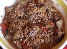 Fate imbiondire l’aglio in poco olio e aggiungete le carni spezzettate tranne il fegato. Dopo un quarto d’ora circa eliminate l’eccesso di grasso e unite a tutto il fegato tagliato a fettine, le olive, l’alloro, i sottaceti. Salate e completate la cottura con l’aggiunta di poca acqua calda.
